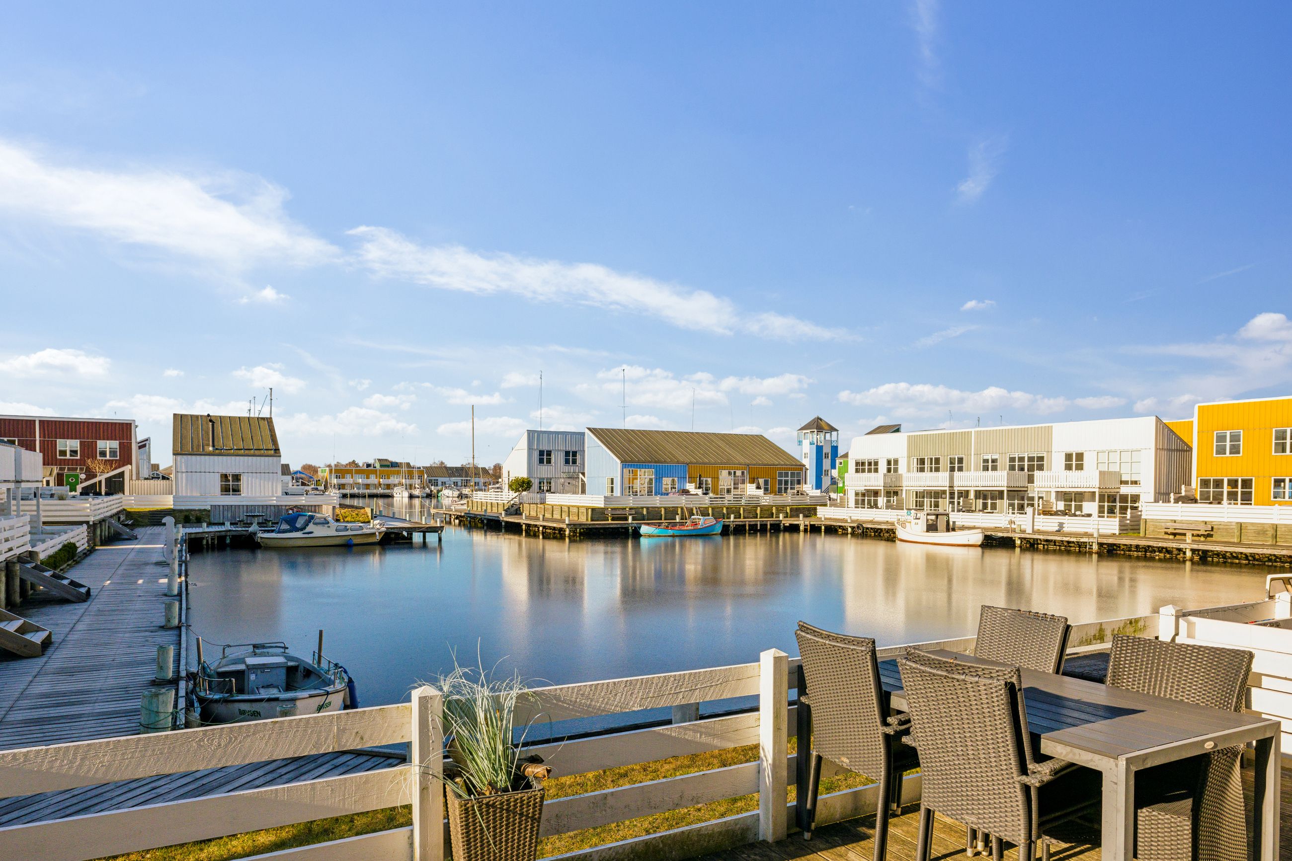 Feriebyen består af flere øer og I får hjemme på øen Krabben. Lejligheden, som kan blive jeres, ligger i stueplan, og til boligen hører flere skønne terrasser. I får en stor, østvendt terrasse, hvor I kan starte dagen med morgenkaffe og morgenbrød i morgensolen. Ud mod havnebassinet venter en solrig sydvestvendt terrasse, hvor I kan runde dagen af med aftensol over vandet.