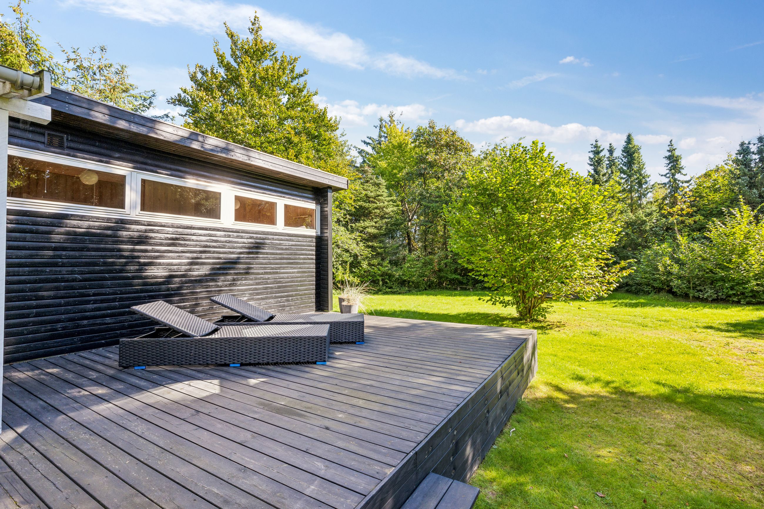 Nærmere huset er der desuden etableret nogle skønne terrasser, der giver dig et uderum med næsten lige så mange kvadratmeter, som der er indenfor. Den ene terrasse putter sig mellem huset og værkstedet, så her kan du virkelig sidde dejligt i læ og nyde morgenkaffen, mens du senere kan rykke over på den sydvendte terrasse, der får sol igennem hele dagen. Skulle det derimod begynde at dryppe, kan du altid trække ind under overdækket, hvor regnen trommer på taget.