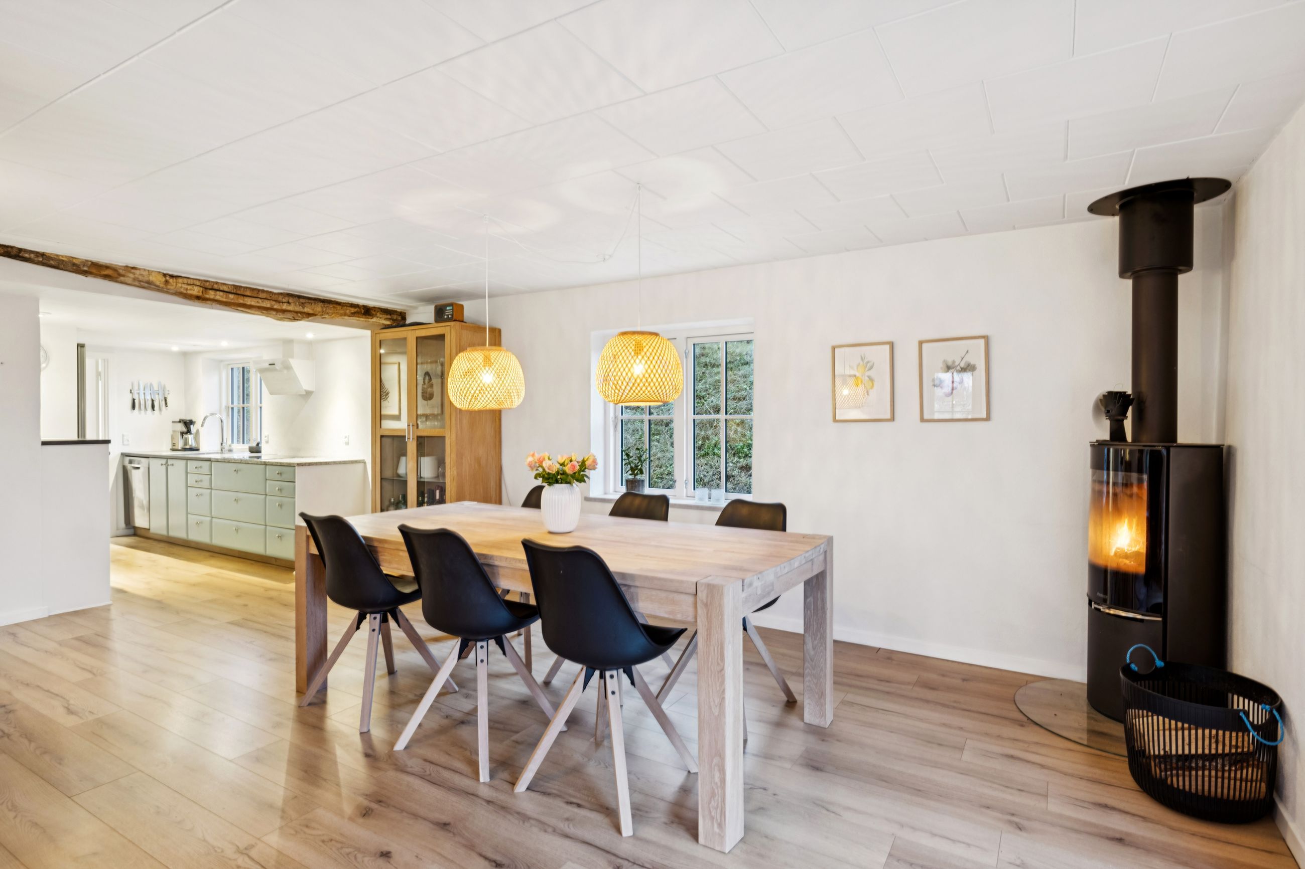 Der er indrettet og opdateret med sans for charme og hygge – se f.eks. lige den knitrende brændeovn og den smukke træbjælke imellem køkken og stue! Fra stuen træder I tilmed direkte ud på terrassen, og mens der kokkereres i køkkenet, vil samtalen let flyde fra gryderne ind til stuen, hvor lektielæsningen og middagene kan få plads – køkken og stue ligger nemlig i åben forbindelse. Stueetagen er desuden hjem for et bryggers, et brusebadeværelse og et værelse, mens I op ad trappen finder yderligere to værelser og en møblerbar repos under skråvæggene.